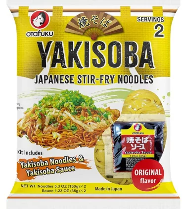 Yakisoba già pronta, completa di condimento e soba per 3 persone. La confezione contiene un kit per la preparazione rapida e veloce degli yaki soba (spaghetti giapponesi-noodles)