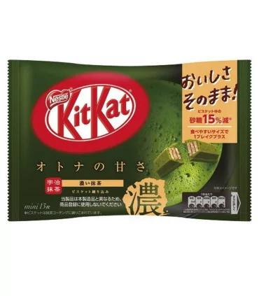 Ingredienti: Copertura di cioccolato bianco, olio di palma, zucchero, lattosio, latte intero in polvere, burro di cacao, biscotti di grano, il tè verde pasta, farina di frumento, olio di palma, tè verde, zucchero, lattosio, il tè in polvere, latte intero in polvere, lievito, cacao in polvere, emulsionante E322, agente di gassificazione E500, acidificanti, pasta di cacao, burro di cacao, Aroma Matcha, estratto matcha.