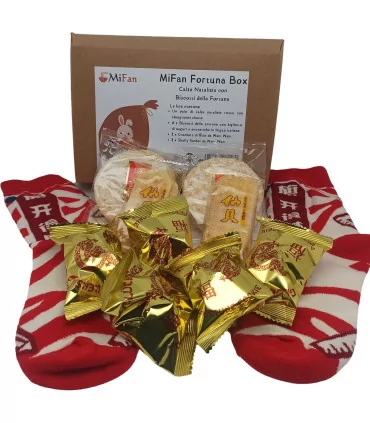 - La box contiene un paio di calzini tradizionali cinesi rossi. Presenta un disegno e un testo di buon auspicio. Durante il Capodanno cinese si indossano calzini rossi per portare fortuna al nuovo anno.